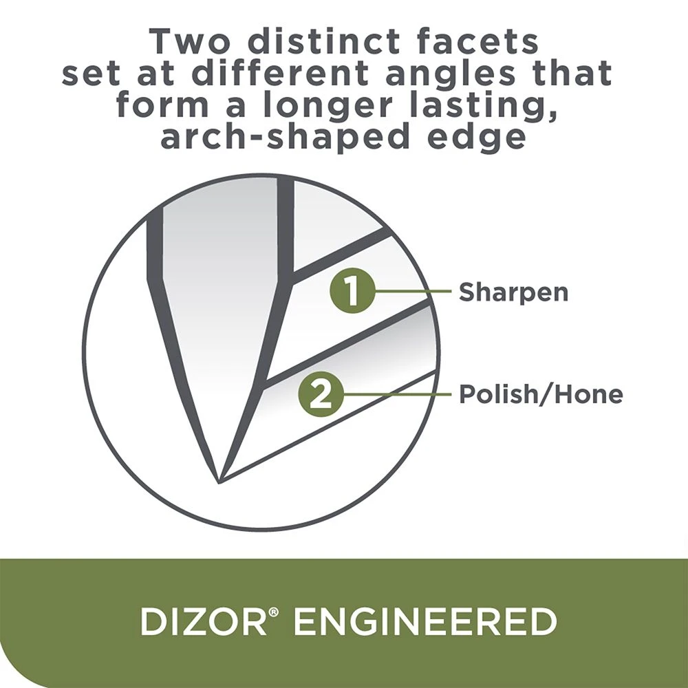 - Two distinct facets are set at different angles, forming a long-lasting, double bevel edge