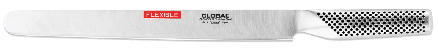 The Global G69 – 27cm Ham & Salmon Slicer is a stainless steel hand wash only slicer. It is 27 cm long, which will yield a perfect roast size for dinner.