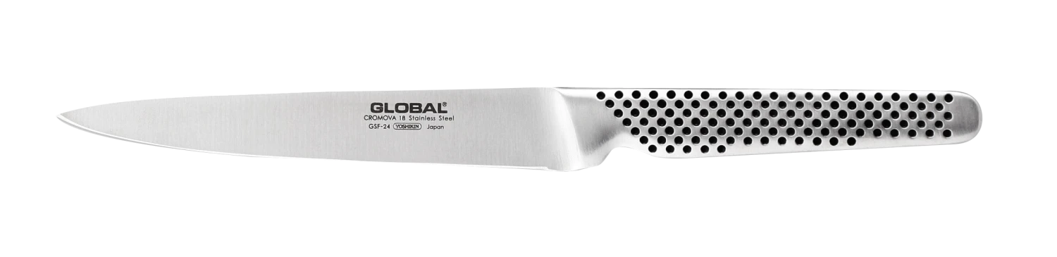 The Global GSF24 – 15cm Utility Knife is ideal for daily cooking tasks, such as cutting, dicing and chopping a variety of meats, fish, vegetables and fruit.
