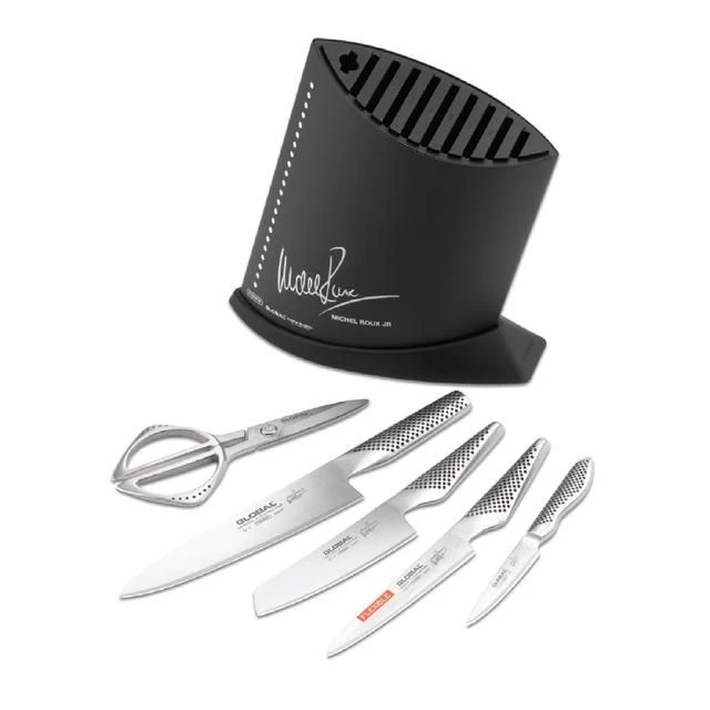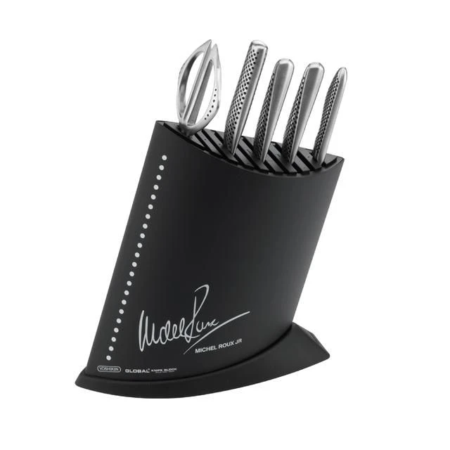Keep your favourite cooking knives on hand at all times and in plain view whenever you need them with this beautiful Global Michel Roux Jr GR52/BRW6 – 6 Piece Black Knife Block Set
