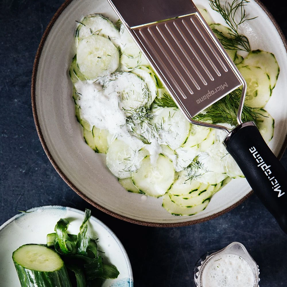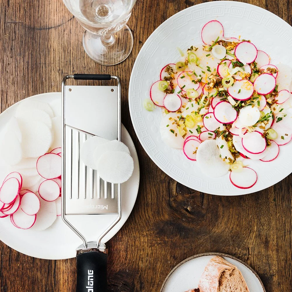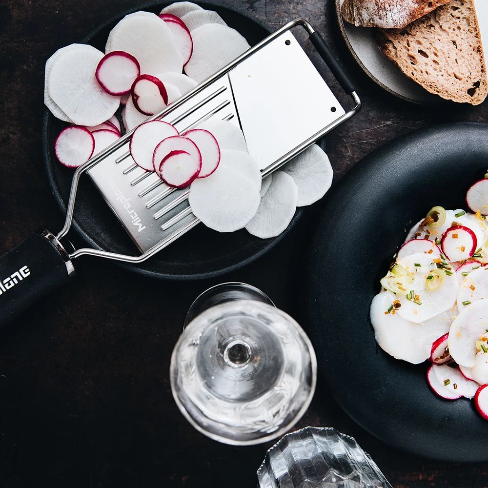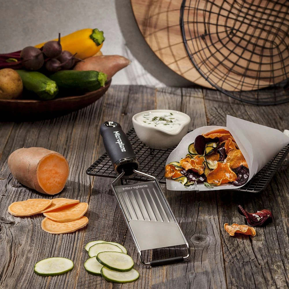 With the Microplane Gourmet Series Slicer, you’ll soon be able to slice vegetables like a pro. The comfortable and ergonomic soft-touch handle provides an excellent grip and the loop for optional hanging makes it easy to store.