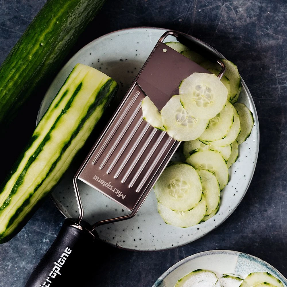 The Microplane Gourmet Series Slicer has been designed for easy, quick slicing of carrots, zucchini, radishes and potatoes. The non-slip base provides stability and the slicer comes with a cover for safe storage. It is made from surgical grade stainless steel with etched blades that are 2mm thick.