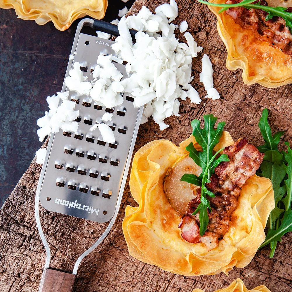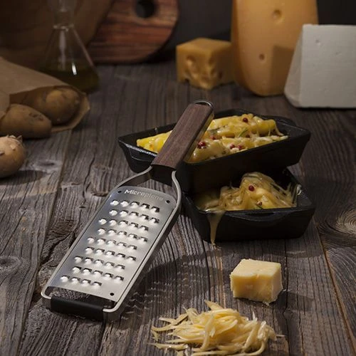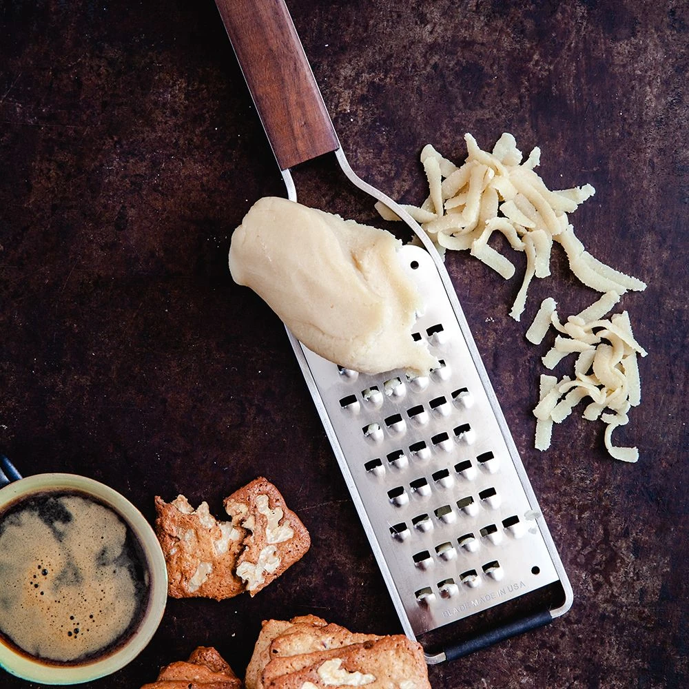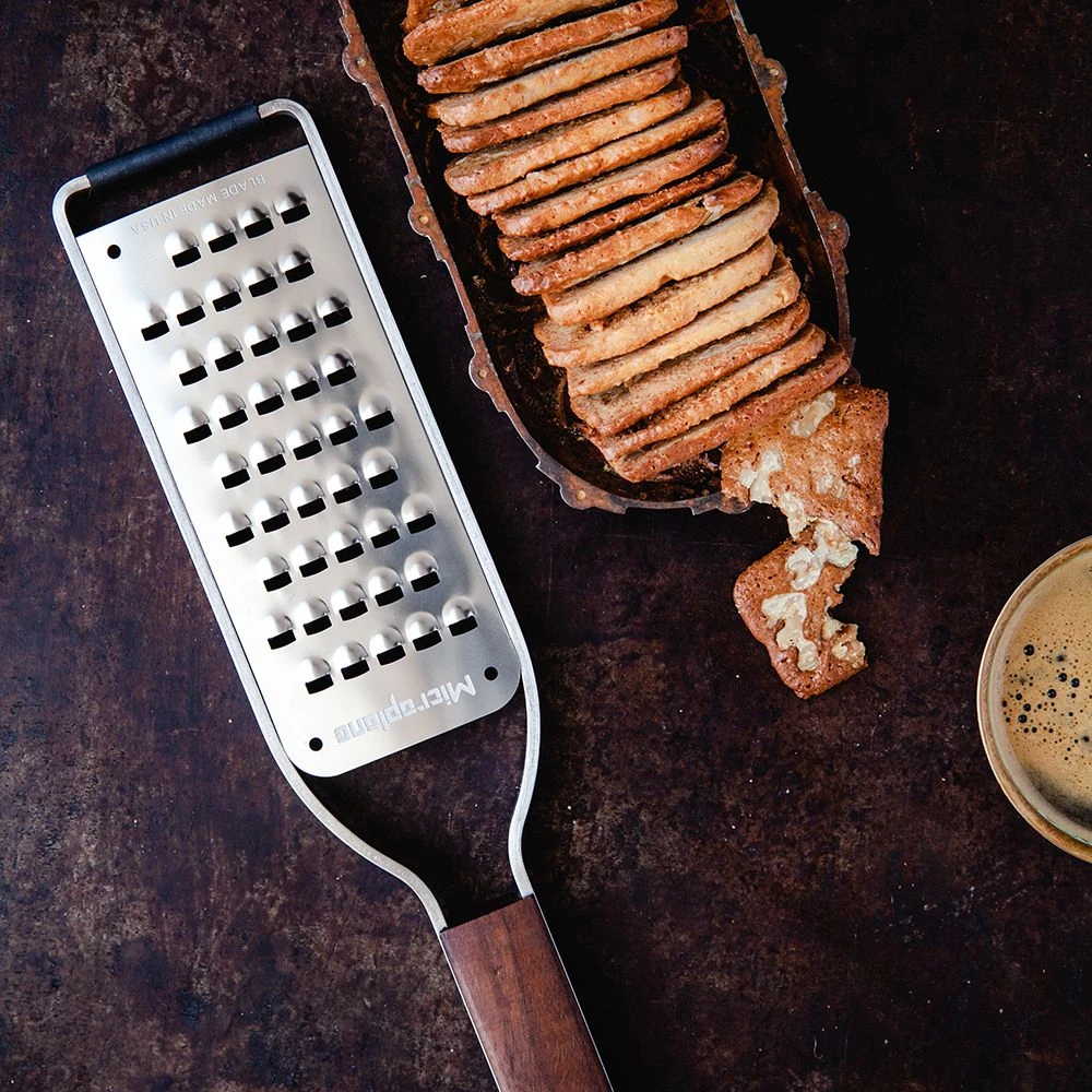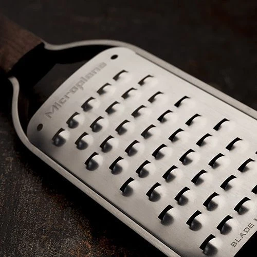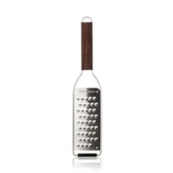 The Master Series Microplane Extra Course Grater has a long-lasting stainless steel blade that is ultra sharp and made of wood sourced from sustainable American Walnut handle. It has a comfortable, grip handle that is perfect for grating a variety of cheeses, carrots, courgettes, and other vegetables. The grater cuts by wounding rather than crushing the ingredients, resulting in a stable, well-grated result. The Grater can be washed by hand and stored in its protective cover.