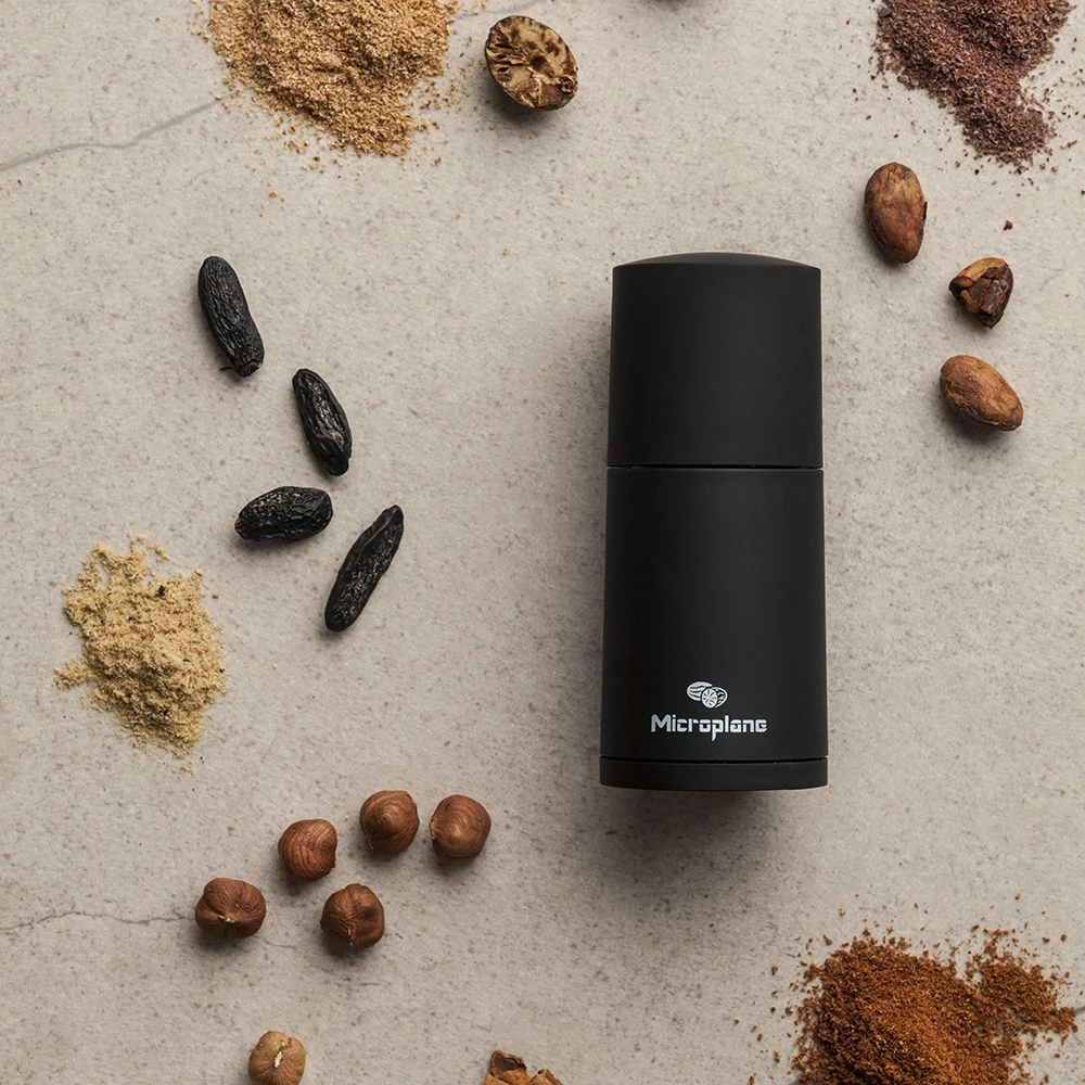 The black Microplane 2 in 1 Spice Mill has razor-sharp grinding blades that can grind cinnamon and nutmeg whole. It is also perfect for grinding hard spices like cinnamon and nutmeg. As a result, the spice mill is suitable for cooking and recipe adjustments. The airtight compartment for storing whole spices guarantees convenience. The soft touch coating of the spice mill makes holding and using it easy. It completely disassembles for cleaning.