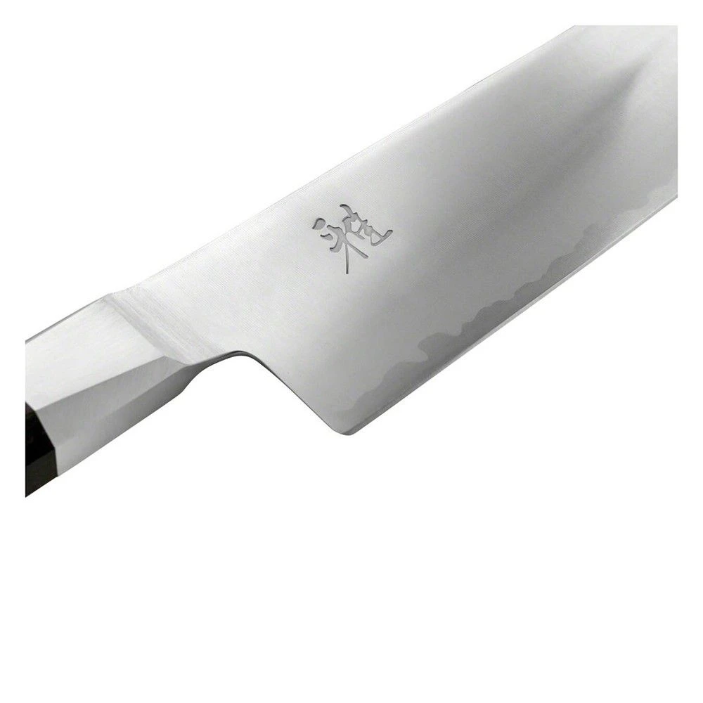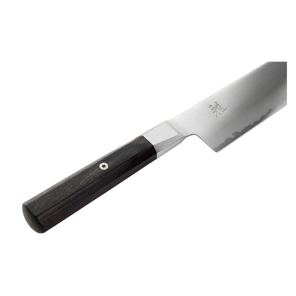 The octagonal design of the Pakka wood handle and bolster ensure comfort and safety. The MIYABI logo is engraved on the blade. This Shotoh can be used for vegetables, fruits and other food preparation tasks. Made in Seki, Japan from a single layer of FC61 steel.