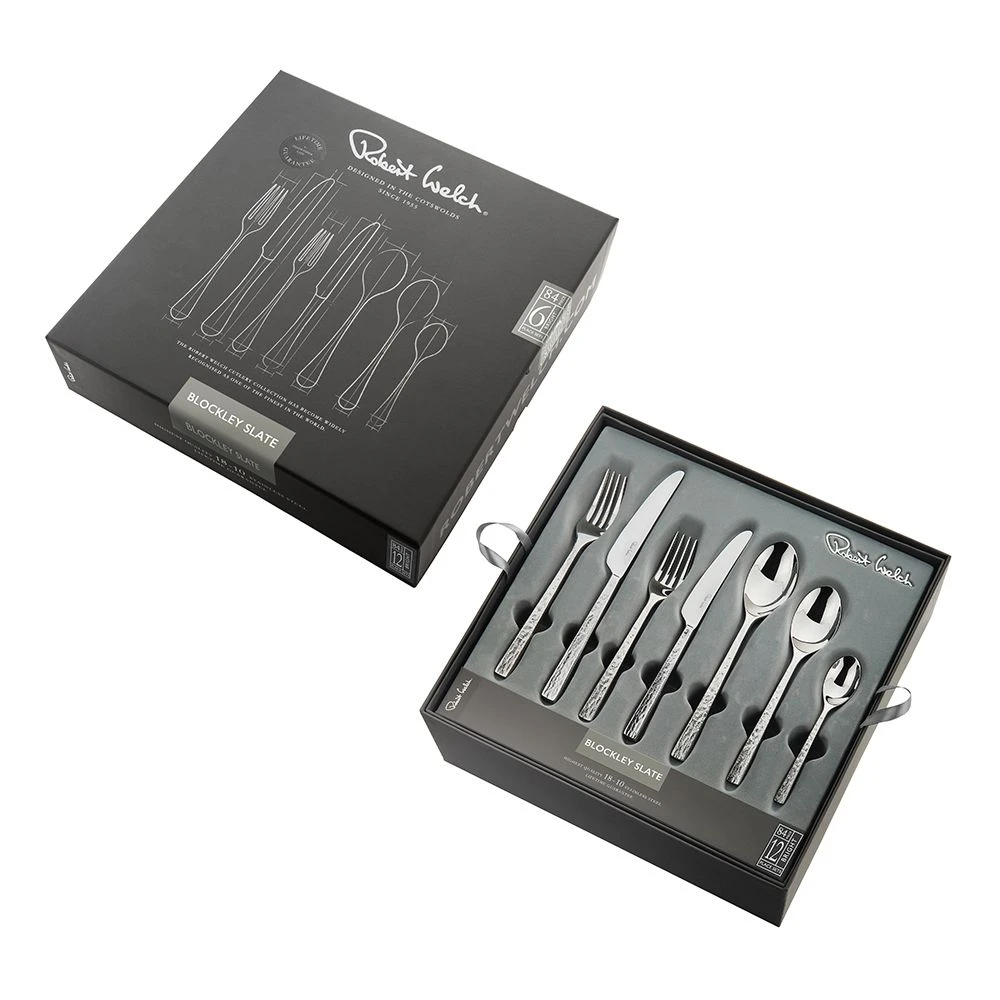 A 84 piece, gift boxed cutlery set from the dramatic Blockley Slate Bright cutlery range, which consists of 12 table settings. Made from the finest 18/10 stainless steel with a mirror-polished and textured finish. Blockley Slate Bright cutlery has a Lifetime Guarantee and is dishwasher safe.