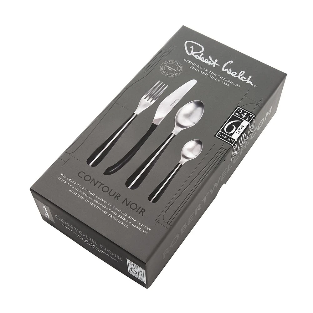 A 24 piece, gift boxed cutlery set from the dramatic Contour Noir cutlery range, which consists of 6 table settings. Made from the finest 18/10 stainless steel contrasted with a smooth black handle. Dishwasher safe with a 10 year guarantee.