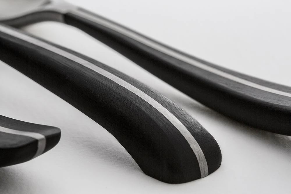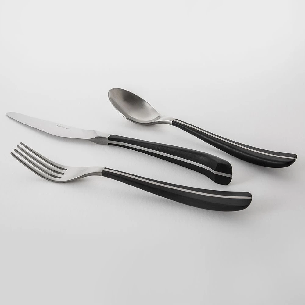 The table knife is designed to rest either traditionally or vertically on the table; either way sees the cutting edge of the knife raised from the table top. The elegant styling of Contour Noir forks and spoons balance against the silhouette of the table and steak knives.