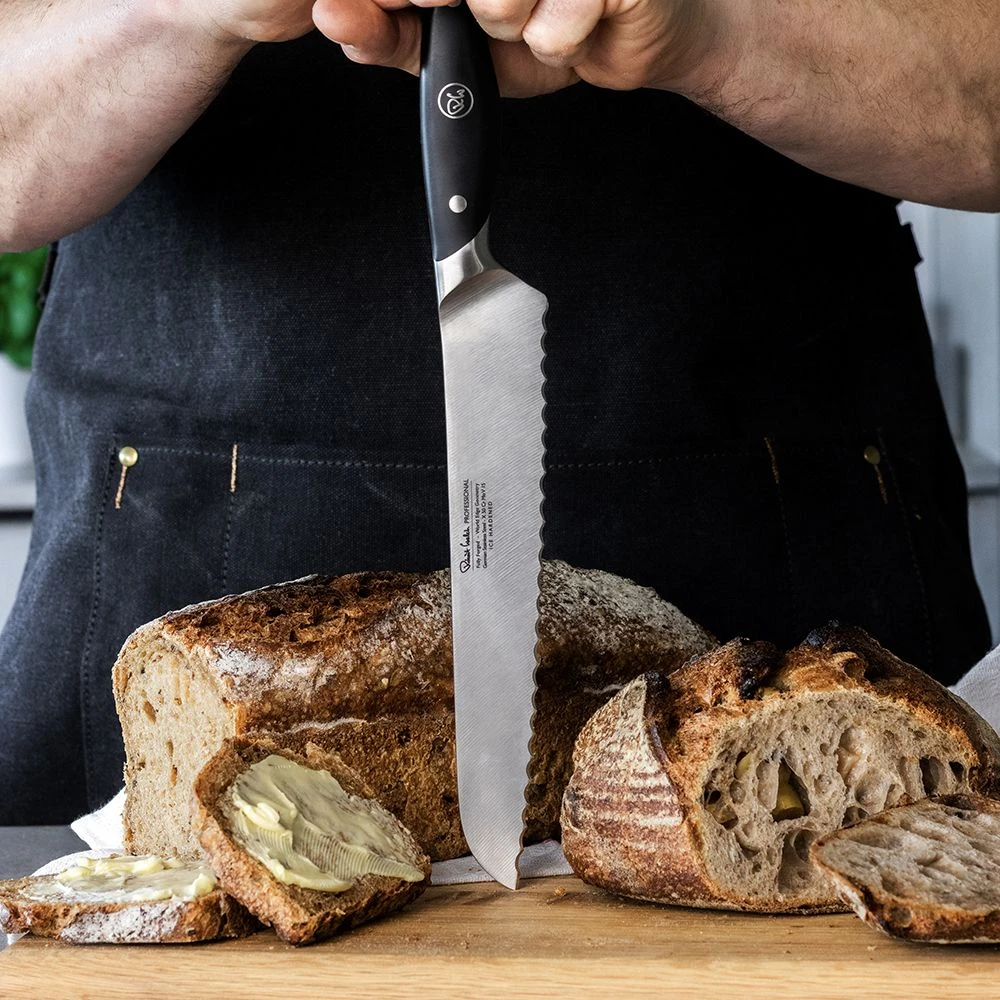 The 22cm bread knife features a pointed tip and serrated blade, which will easily cut through crusty bread and loaves without squashing or tearing. Fully forged from high quality German stainless steel with a classically shaped DuPont™ handle.