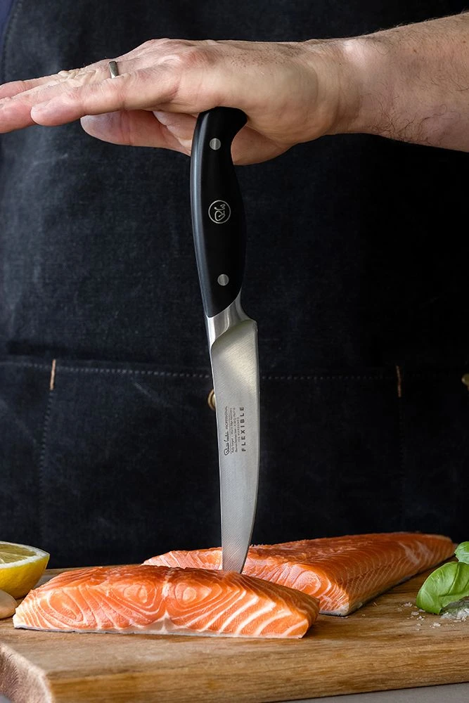 The precision sharpened Professional 16cm/6.5″ flexible utility knife has a flexible blade, for skinning and filleting fish or boning and carving meat and poultry. The added flexibility ensures ease of handling around the bone, and makes more precise cuts to help reduce any damage to delicate flesh.
