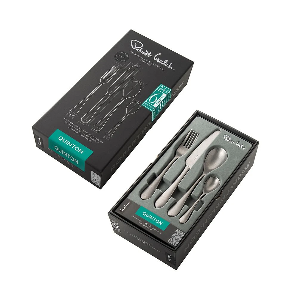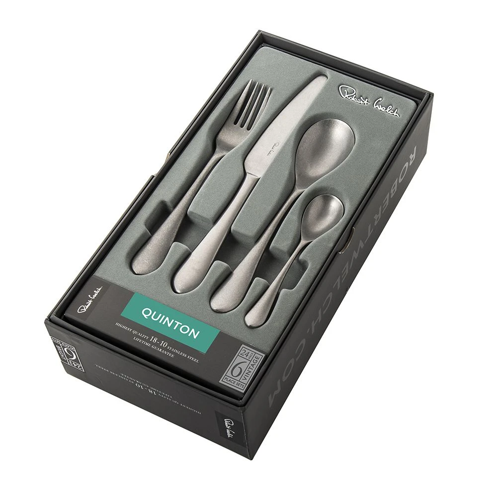 A 24 piece, gift boxed cutlery set from the curvaceous Quinton Vintage cutlery range, which consists of 6 table settings. Made from the finest 18/10 stainless steel with a full-vintage finish. Quinton vintage has a lifetime guarantee and is dishwasher safe.