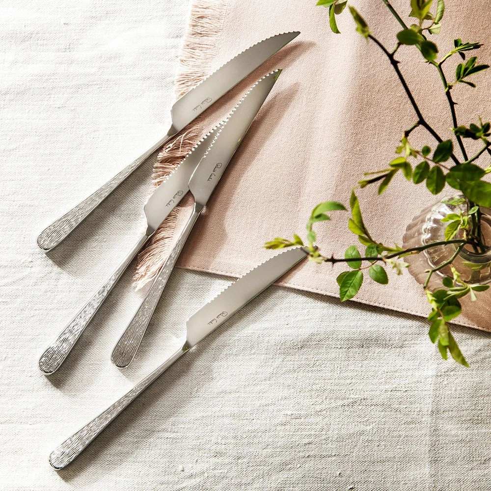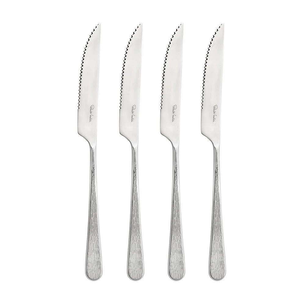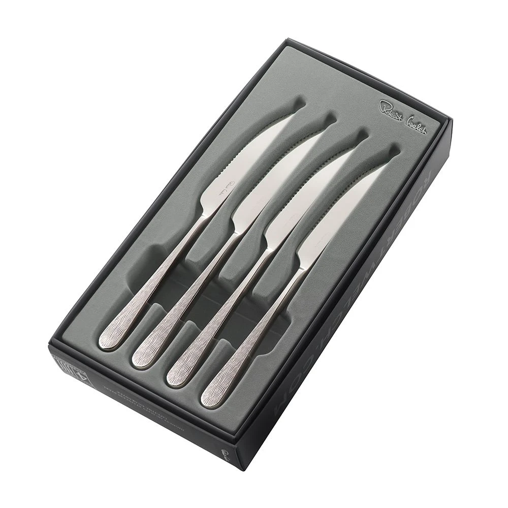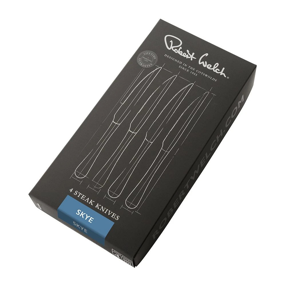 A 4 piece gift boxed steak knife set from the beautifully sophisticated cutlery pattern SSkye. Mirror-polished finish and made from specially hardened stainless steel. This set has a lifetime guarantee and is dishwasher safe.