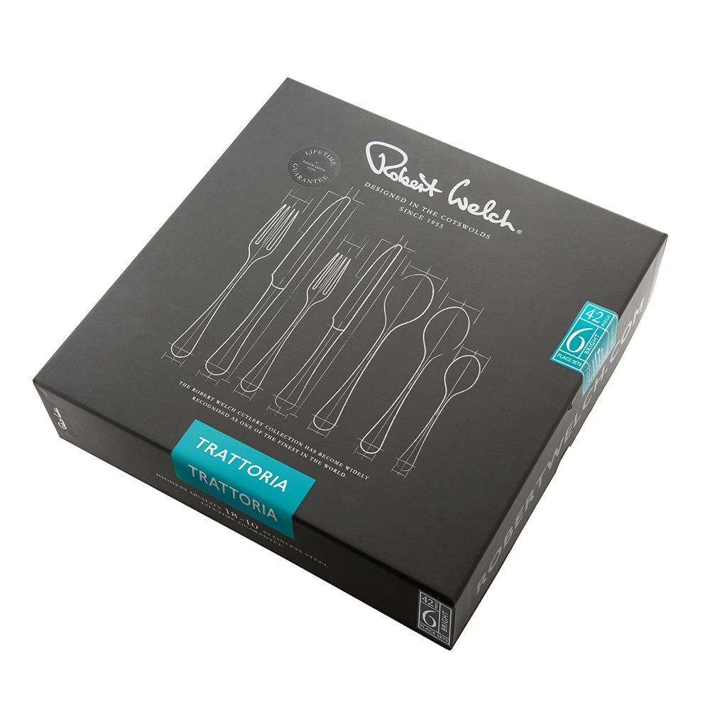 A 24 piece, gift boxed cutlery set from the traditional, bistro-styled Trattoria Bright cutlery range, which consists of 6 table settings. Made from the finest 18/10 stainless steel with a mirror-polished finish, and matt finished handles. Dishwasher safe and a 10 year guarantee