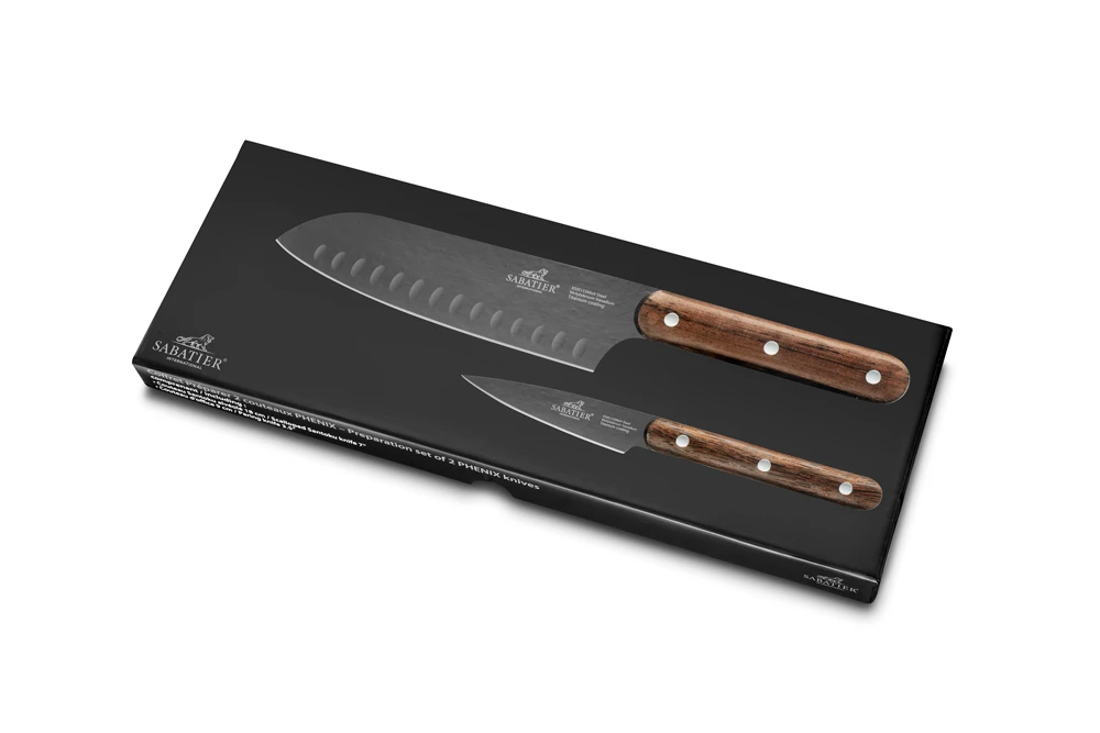 The Sabatier® Phenix 2 Piece Set – Paring Knife & Santoku Knife is the perfect choice for any kitchen. This set includes a paring knife and a santoku knife in a beautiful Wenge wood handle. The blades are made of X50CrMoV15 stainless steel, which is known for its durability and ease of sharpening. The blade has an impressive titanium covering that looks great and provides superior protection against corrosion.