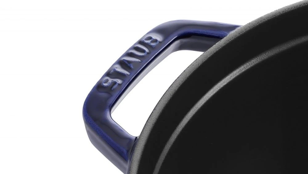 Staub Cast Iron Cocotte 26cm in Dark-Blue, a cast iron roasting pans, with a matt black enamel coating on the inside. The main benefits of this enamel layer include its immediate usability, good braising and stewing effects, and the properties of the material improve with use and age.