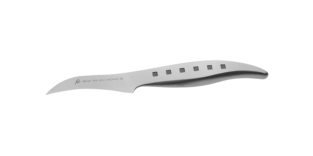 The Tojiro Sharaku Mono 7cm Peeling Knife (FJS-19) is part of the Sha Ra Ku Mono range which has a distinctive angular pattern, to call back to the traditional Samurai sword, whilst the black dot motif in the handle represents a row of urban windows. The perfect knife for peeling, paring and chopping smaller food items. It is also used to make a cut known as a tourné cut in vegetables such as carrots. It is a specialised type of paring knife.