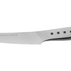 The Tojiro Sharaku Mono 13cm Tomato Knife (FJ-08) is part of the Sha Ra Ku Mono range which has a distinctive angular pattern, to call back to the traditional Samurai sword, whilst the black dot motif in the handle represents a row of urban windows. The blades made of Molybdenum Vanadium steel offer good cutting performance with high levels of durability.