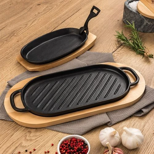 Sizzle your foods to perfection with the Tramontina Cast Iron 24cm Oval Sizzler Plate and Wood Base. This is a versatile, heavy-duty item that can be used on any heat source. The cast iron construction makes it durable and easy to clean.