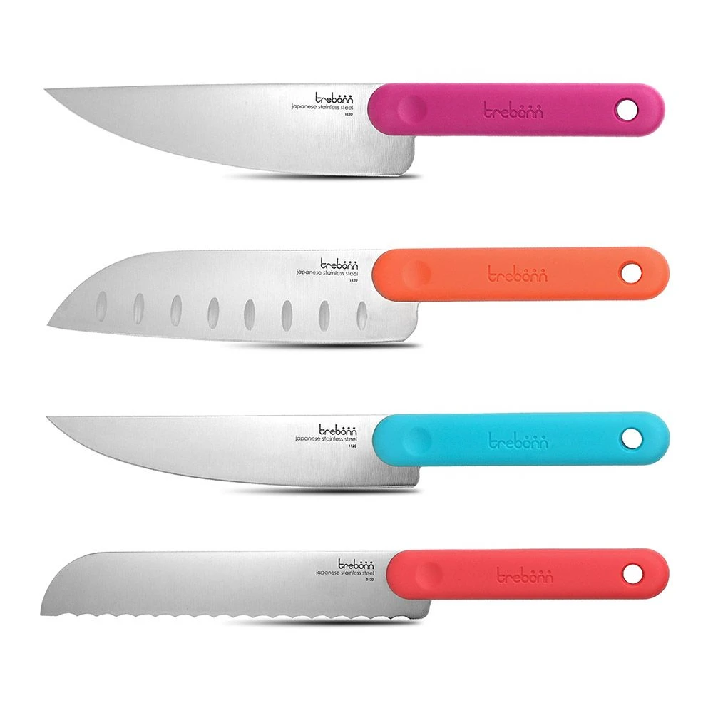 Set of 4 high-performing Japanese stainless steel knives, professional V-shape blade section. Knife handle made in soft-touch non-slip material, for comfortable and secure grip. With a hole in the handle for the ability to hang up