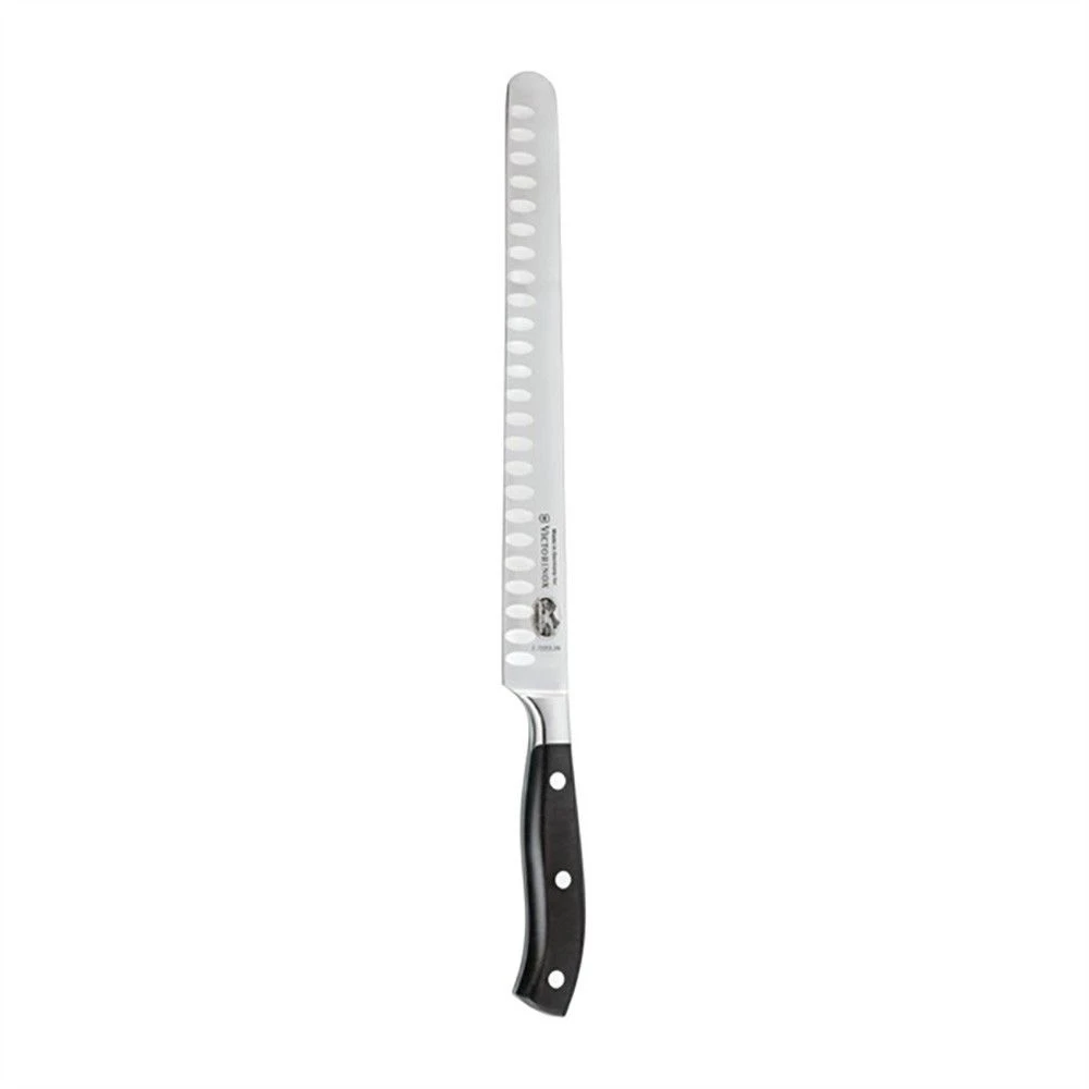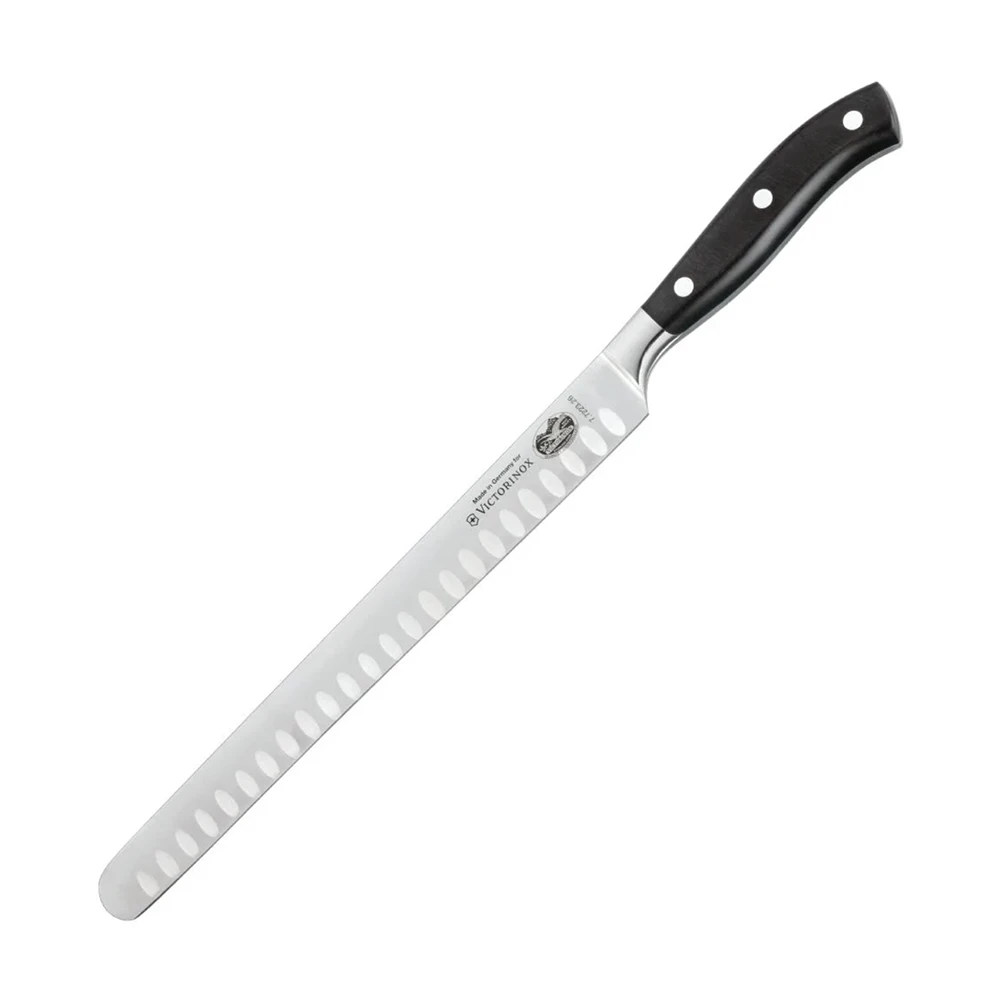 Forged from a single piece of high quality stainless steel alloy, this premium slicing knife from Swiss makers Victorinox has a fluted edge, creating air pockets in between the blade and the food to prevent thin slices from sticking to the blade.