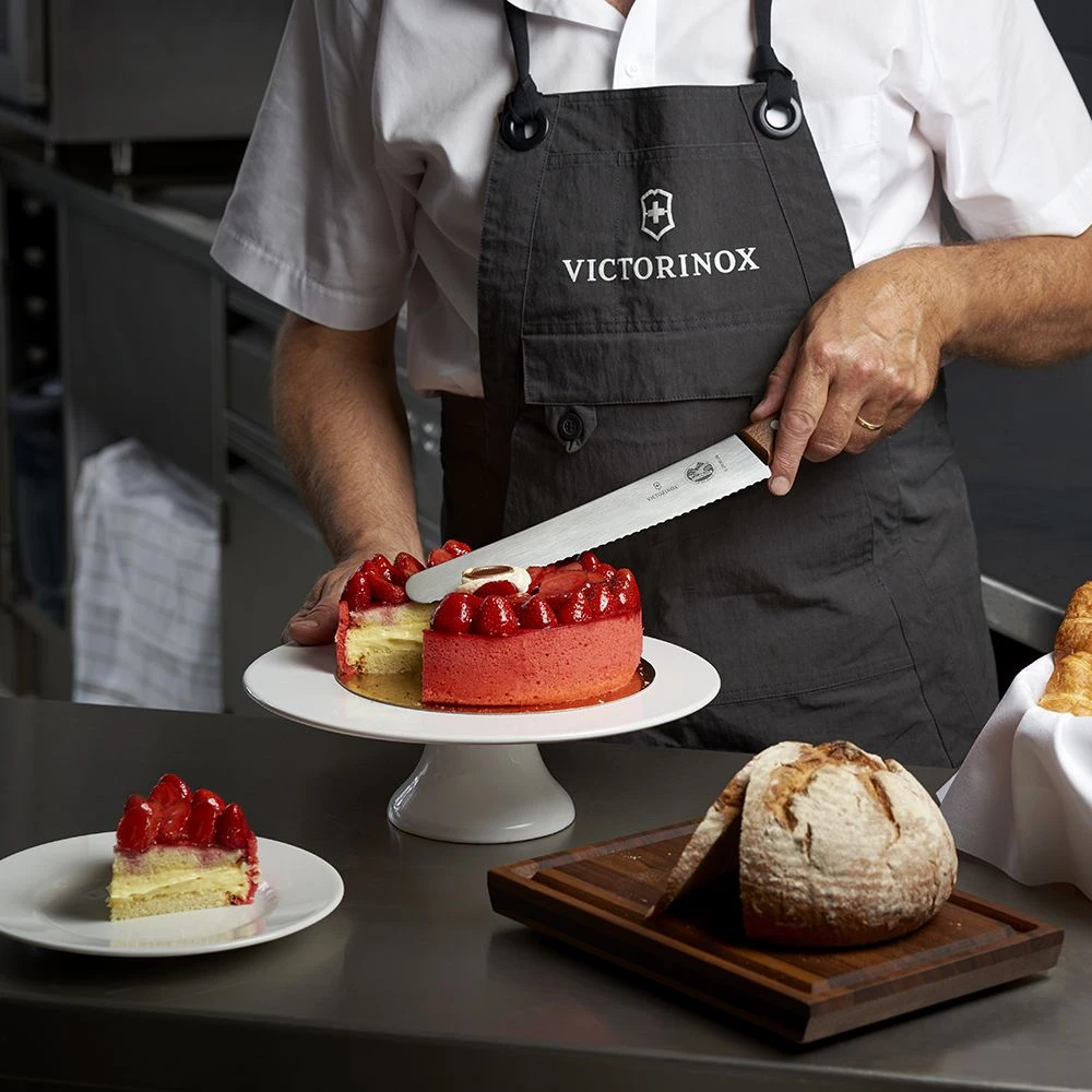 The Victorinox Wood 26cm Pastry Knife with Serrated Edge (Gift Box) is an elegant knife for slicing cakes and pastries. The Pastry Knife will slice right through pastries, baked goods and bread without a single crumb.