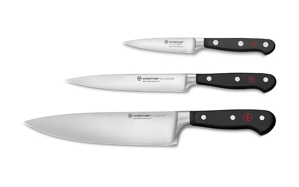 Wusthof Classic 3 Piece Set, Paring, Utility & Cooks Knife. This 3 piece Wusthof classic set includes the 20cm cooks knife, 16cm utility knife and 9cm paring knife. Perfect for everyday use in the kitchen.