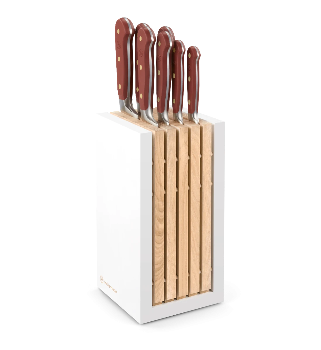 Enjoy your new knife block filled with Wüsthof Classic knives, combined with a dose of colour to complement your lifestyle and your kitchen. This designer knife block with inserts of oiled ash is a stylish joy.