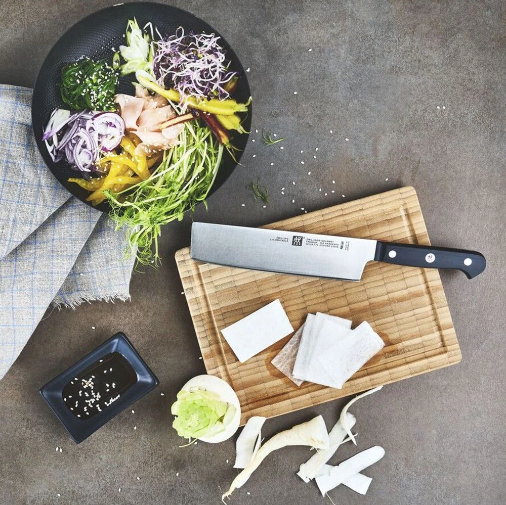 Known for its quality and performance, the Zwilling Gourmet Nakiri 17cm is a Japanese vegetable knife made to cut vegetables, herbs and salads.
