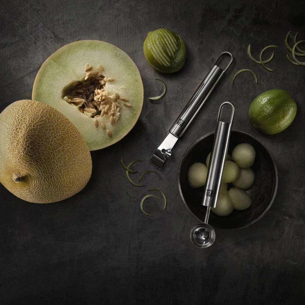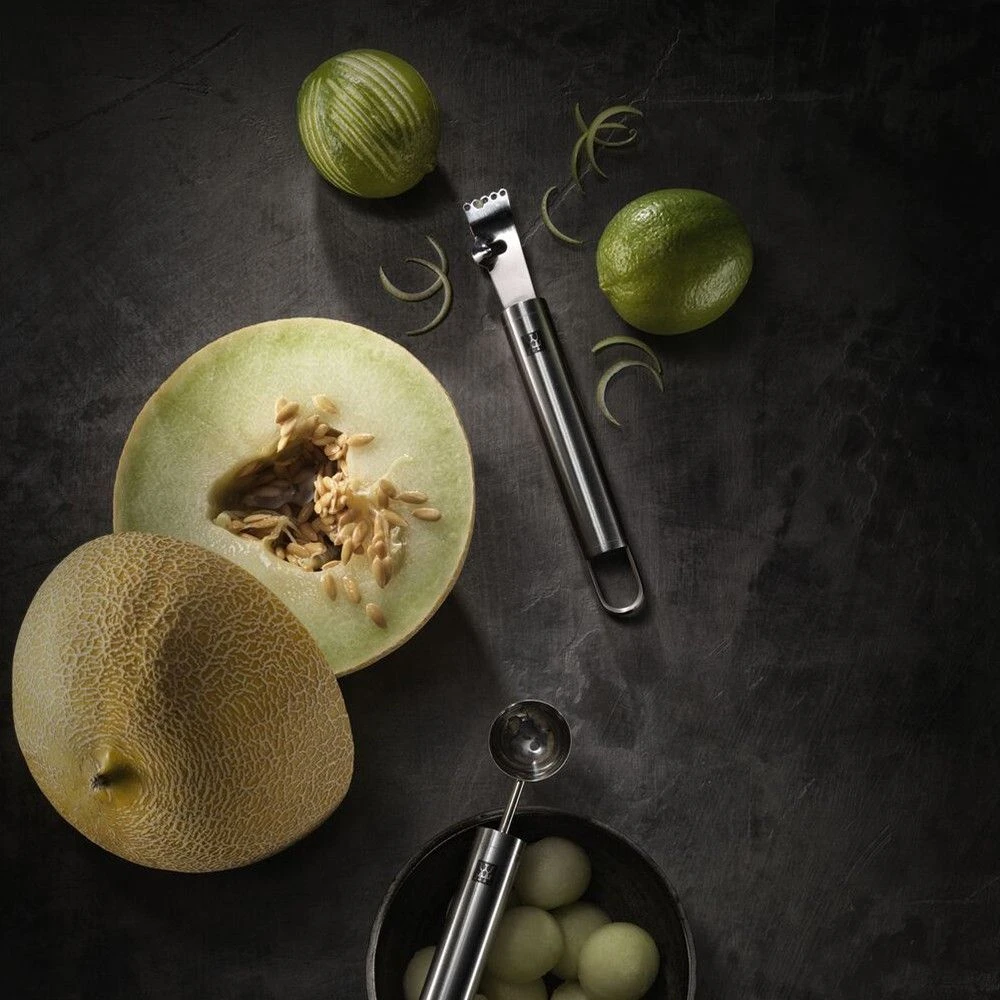 The Zwilling Pro series lemon zester allows you to remove decorative strips from citrus fruits. The elegant kitchen gadget features two separate cutting sections for producing varying thicknesses of zest with a single lemon zester. Coarse zest serves as excellent decoration on desserts and cocktails while fine zest lends foods and drinks that certain extra something. At the same time, the bitter, white peel remains on the fruit.
