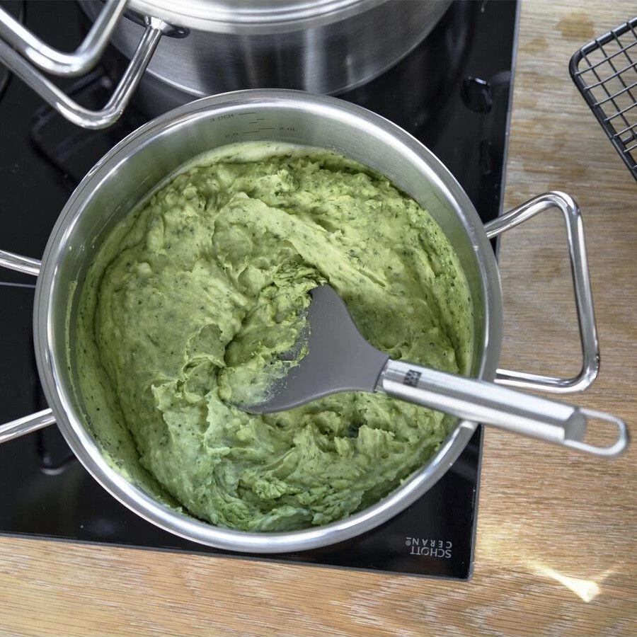 This pot is made of high-quality stainless steel, which resists scratching and does not react with food. The aluminium core ensures the quick and even distribution of heat for safe cooking without hotspots or burning. The pot’s wide pouring rim allows for precise pouring without dripping, while the integrated measuring scale makes it easy to measure ingredients directly on the inside of the pot.